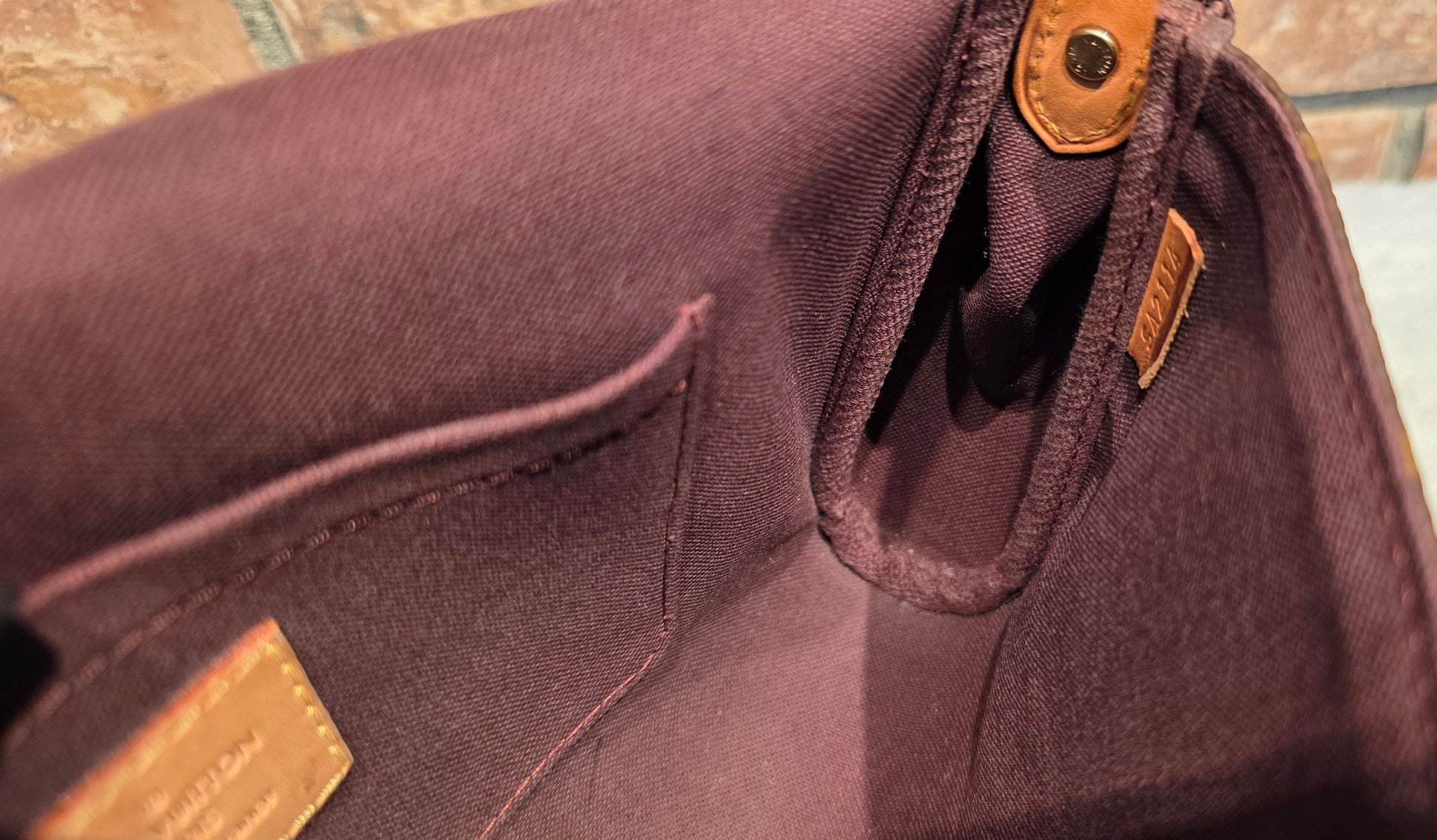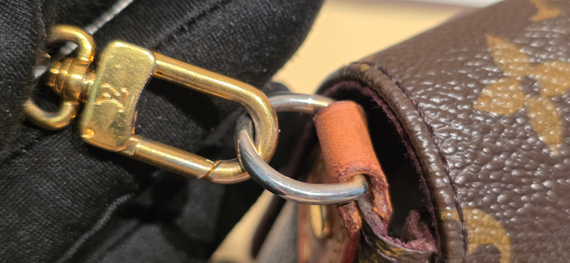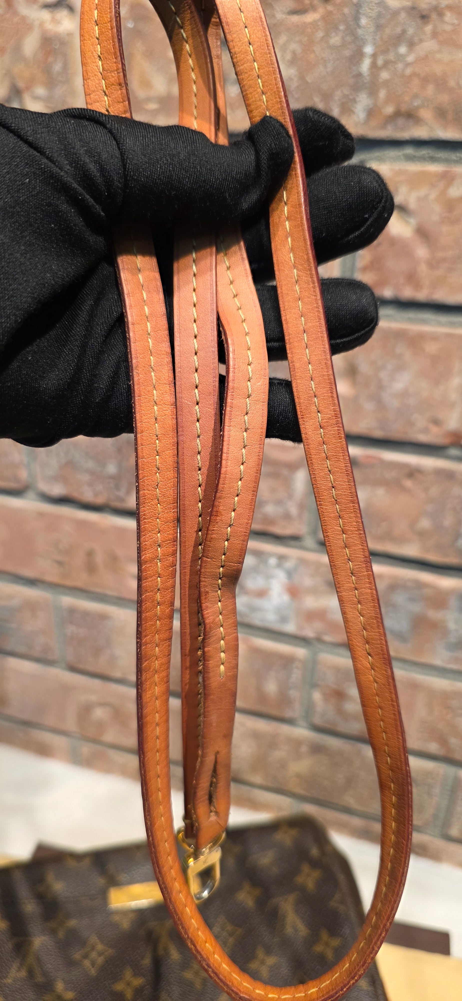 ♥️ Vachetta Strap & Leather Trims: Developed a honey patina. Wrinkling and stains are present on the strap. One end shows prior separation and has been re-glued.