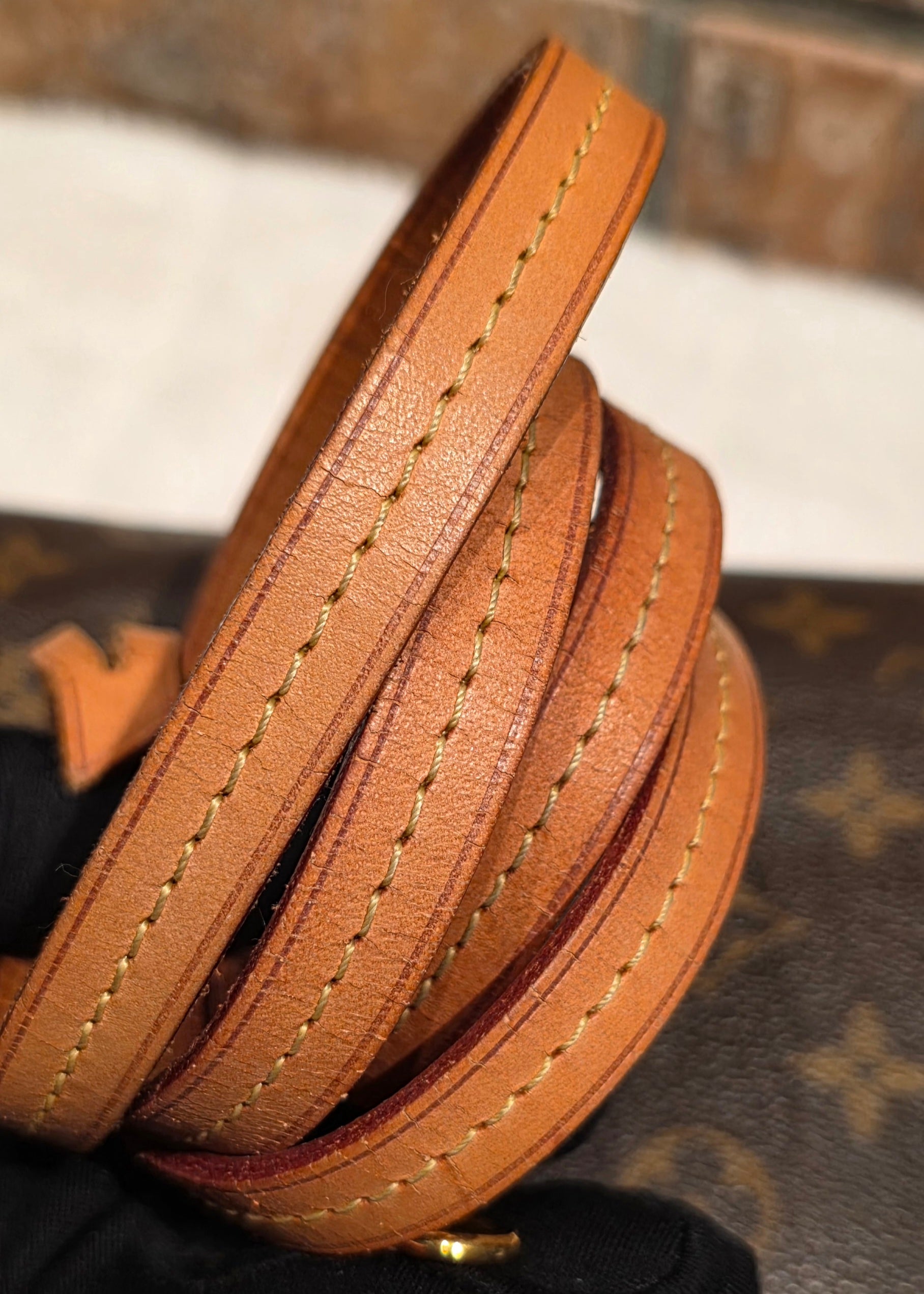 ♥️Vachetta Strap and Leather Trims: honey patina, dryness, wrinkling, stains on strap and leather trims, superficial cracks on strap, doesn't affect use