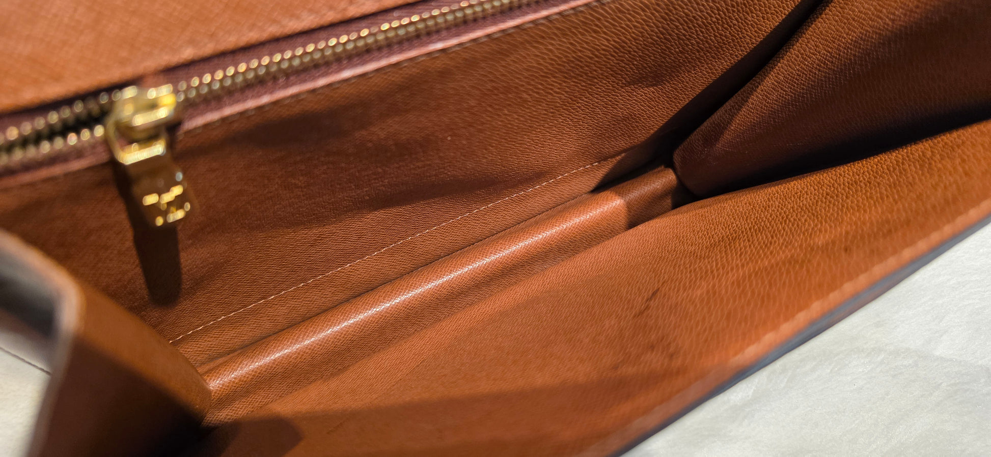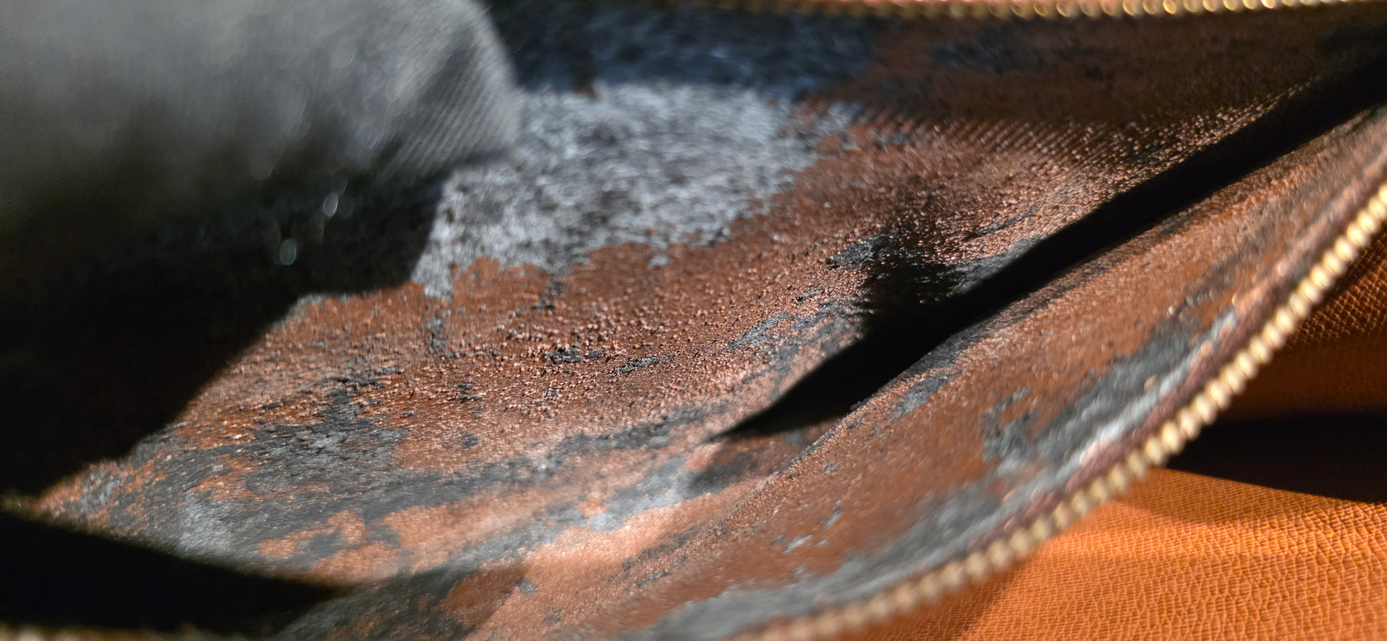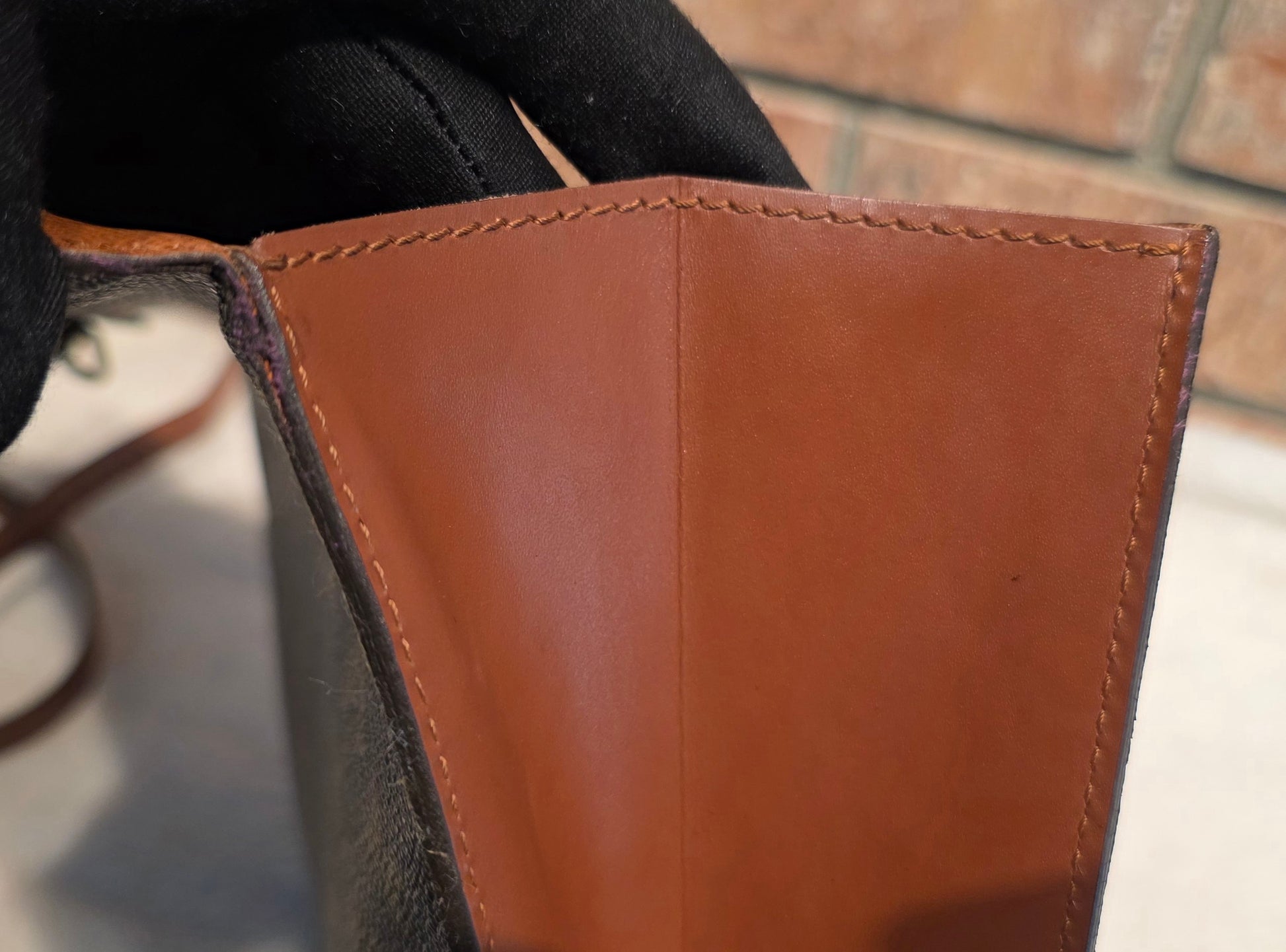 ♥️Interior: a couple of pen stains, zipped pocket is peeling and slightly sticky, pocket zipper has a tight pull, you can DIY clean or just not used it and leave it zipped. Main compartment is clean. Exterior pocket is clean. No foul smell