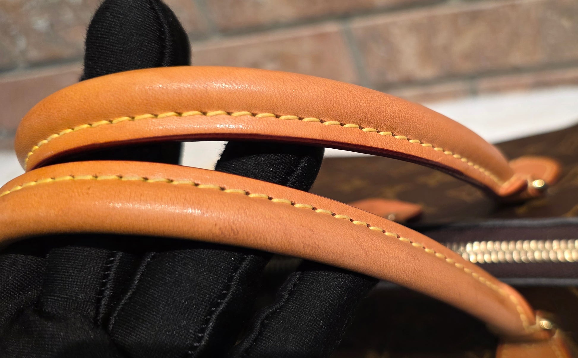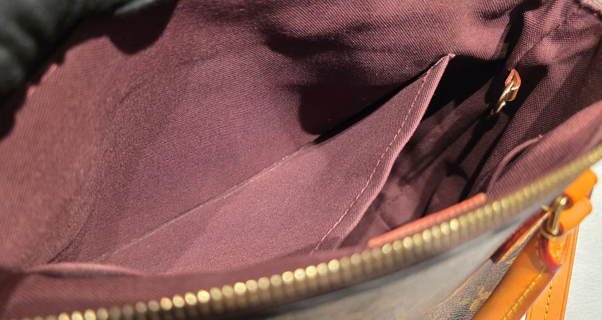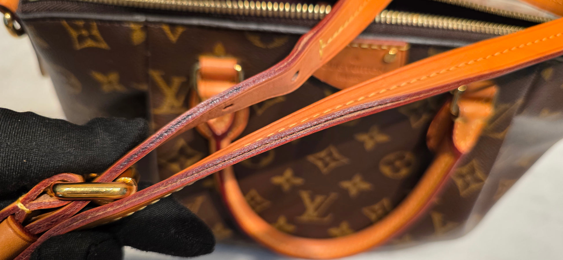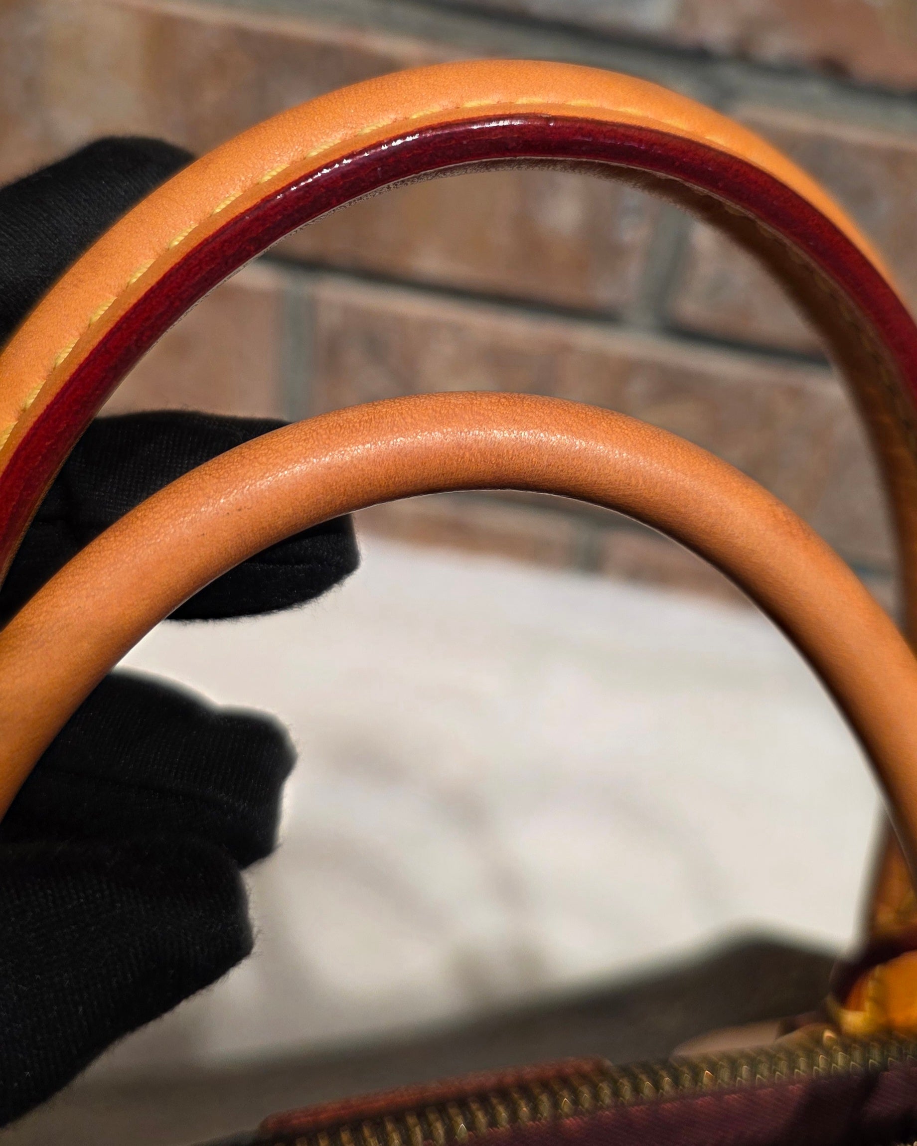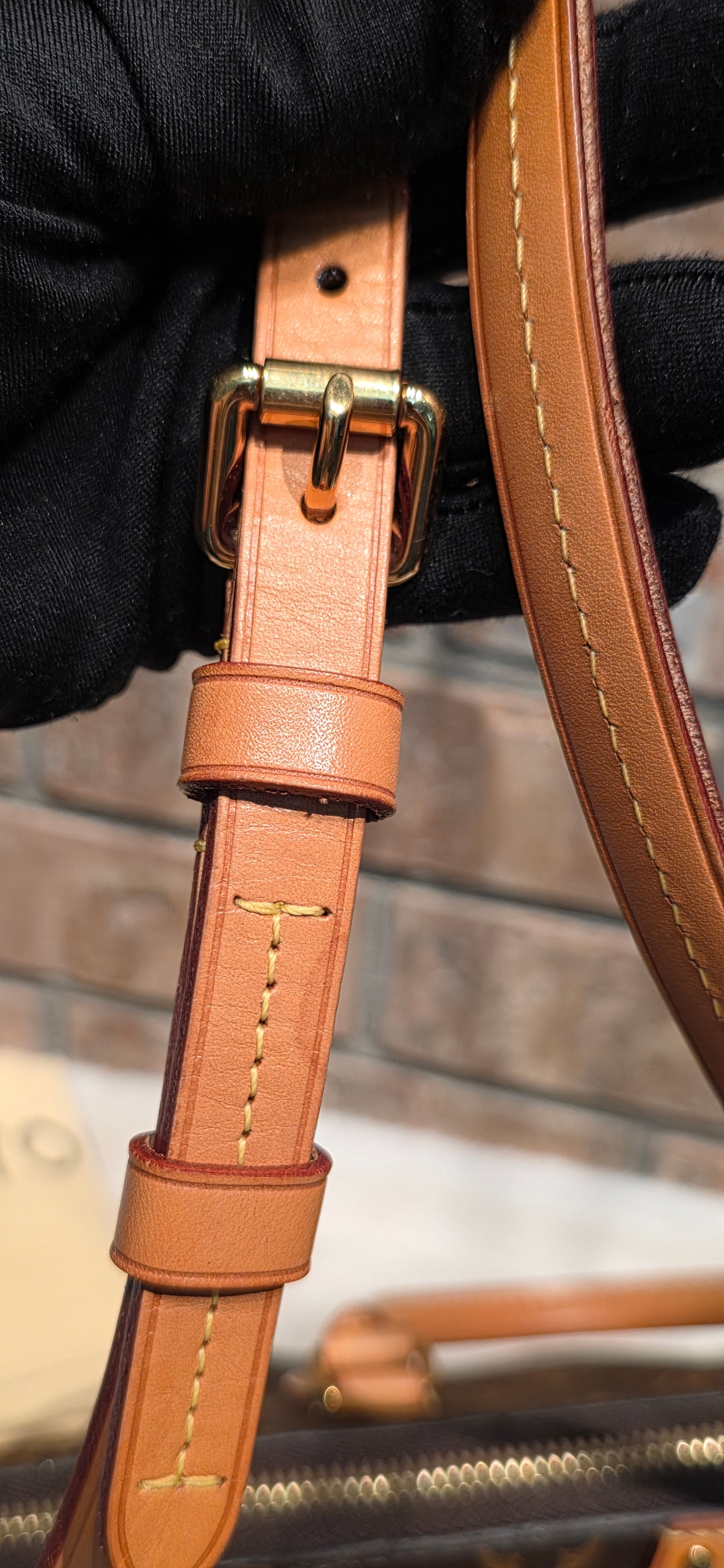 ❤️ Handle & Strap: Vachetta leather with a beautiful honey patina. Light water marks on the handles and water stains on the strap. Some areas of the strap show minor edge separation, and certain sections have been previously reinforced with glue.