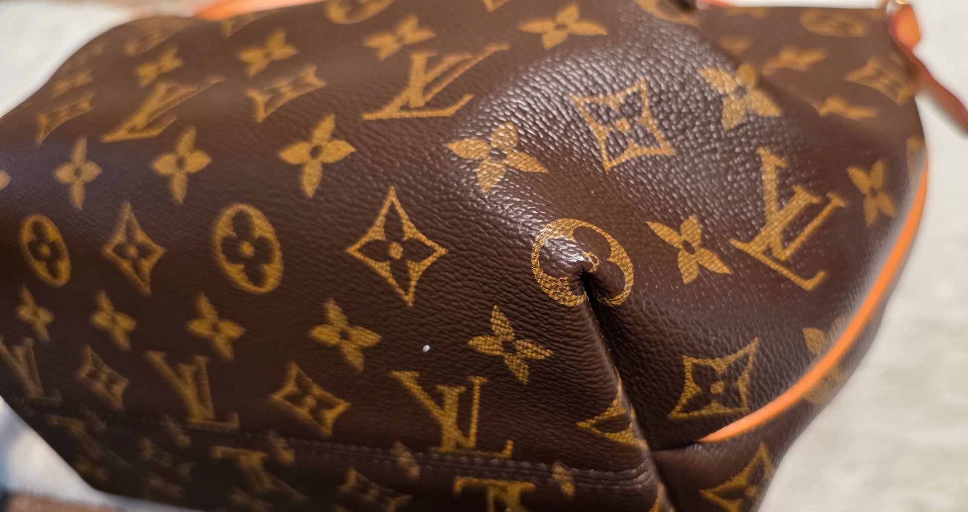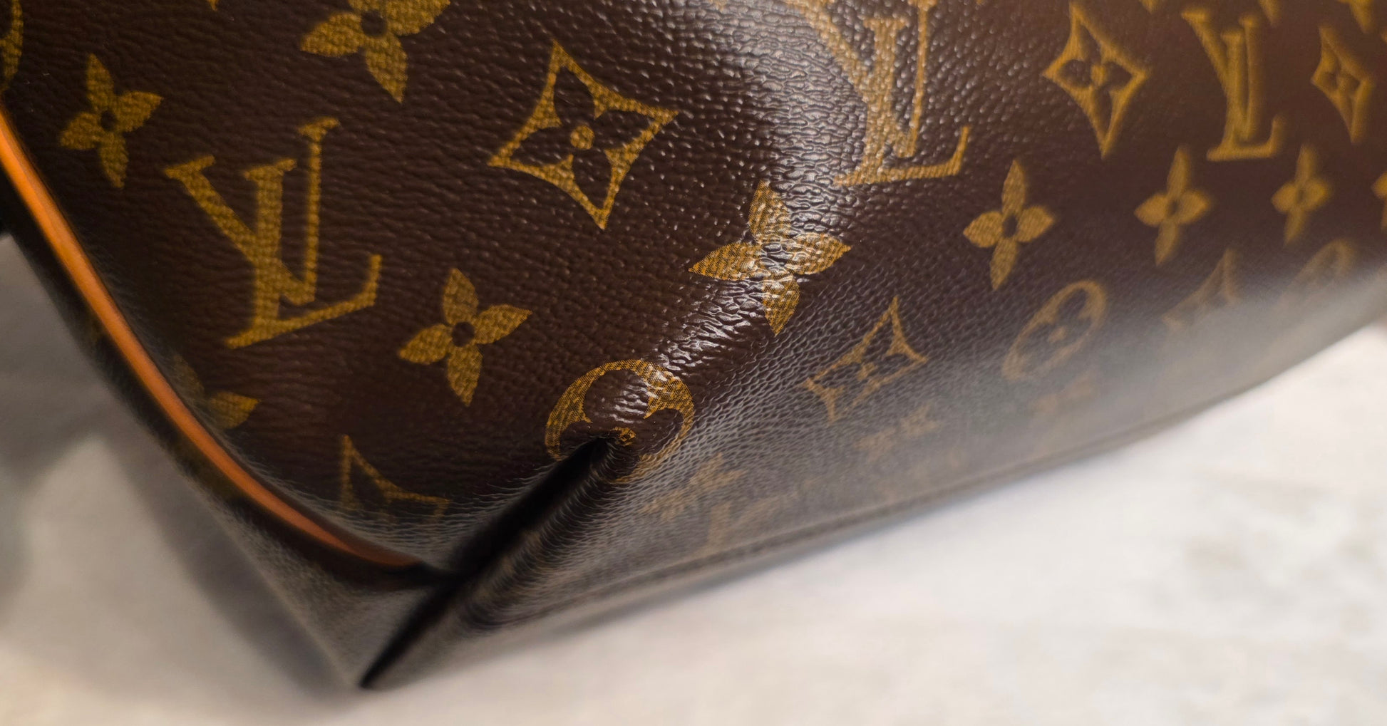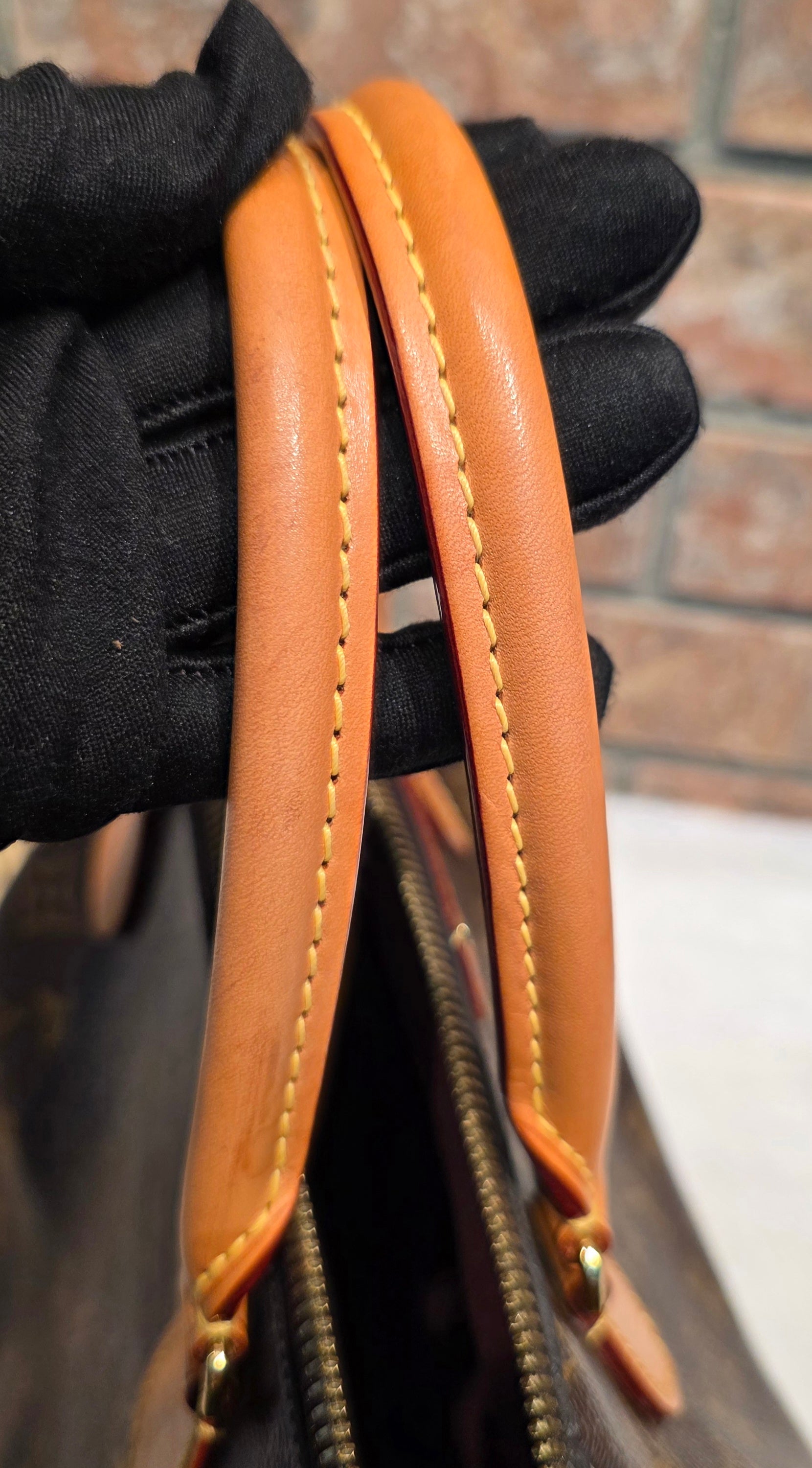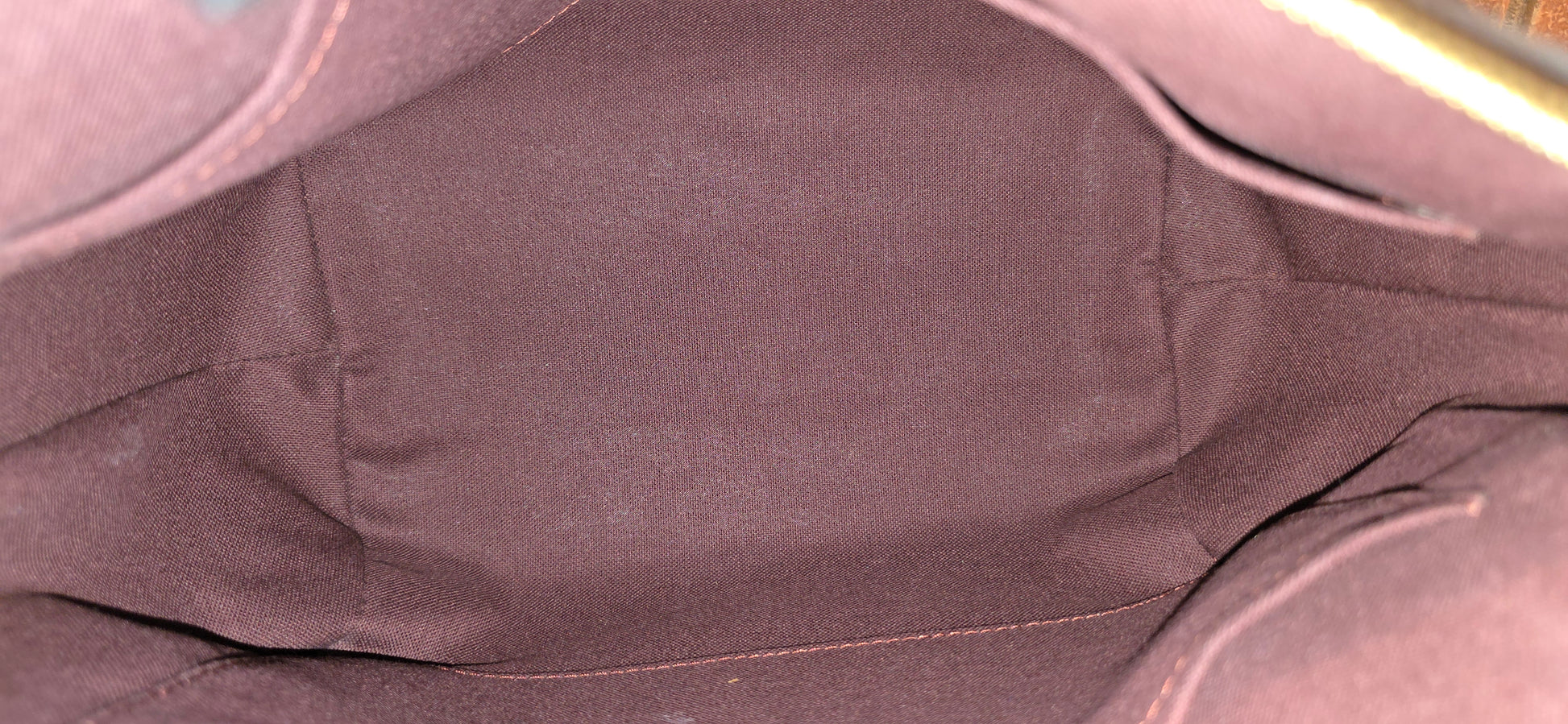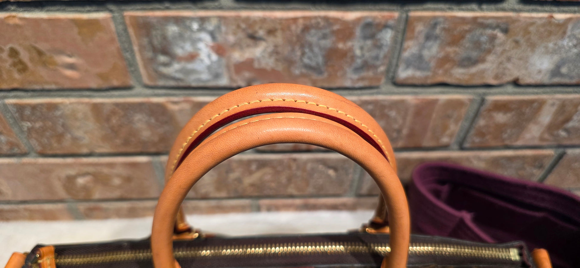 ❤️ Handle & Strap: Vachetta leather with a beautiful honey patina. Light water marks on the handles and water stains on the strap. Some areas of the strap show minor edge separation, and certain sections have been previously reinforced with glue.